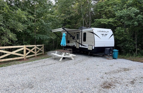 Quaint, clean camper with 1 bedroom and 2 full size bunk beds. The queen bed is plush and very comfortable. Has all the amenities needed for a comfortable stay to include an outdoor kitchen, coffee pot, fresh linens, fire pit, picnic table and 2 camping chairs.