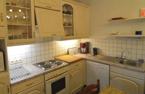 Layout: Ground floor: (Living room(TV(cable), seating area, DVD player, CD player), open kitchen(oven, microwave, dishwasher, fridge, freezer), bedroom(double bed(140 x 200 cm)), bedroom(double bed(140 x 200 cm)), bathroom(bath tub, washbasin), toilet, storage(tumble dryer, washing machine))