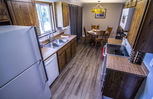 Prepare family meals in the full kitchen or grill outside on the gas BBQ (propane tank level not monitored so let us know if it is getting low) and sit down for dinner at the large dining table with space for 4. The well equipped kitchen features a full suite of appliances including a drip coffee pot and electric kettle. When it's time to turn in, you've got two bedrooms to choose from, each with king beds. Closets have shelving and hangers. The bathroom features a tub/shower combo. In the garage (which is also used for owner storage) you will find a washing machine and dryer.