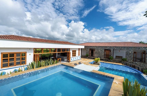 Escápese a un mundo de lujo y tranquilidad en este impresionante refugio de 5 dormitorios y 5,5 baños en Quimbaya, Colombia. Encaramada en un entorno pintoresco, esta magnífica propiedad ofrece vistas impresionantes, comodidades opulentas y un sinfín de opciones de entretenimiento.