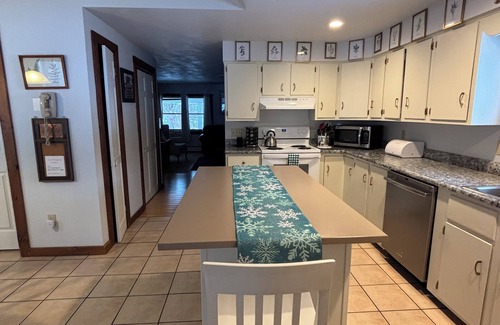 Cooper Creek has its own well for water that is purified through a water softener system installed in the house. There is a Generac (generator) that provides the house with power in case of an outage. The kitchen is fully stocked with full sized electric appliances, a crockpot, Instapot, air fryer, griddle, wok, a food processor, a blender, an electric mixer, and toaster. You will also find baking pans, a full set of pots and pans, serving platters, and a set of 30 place settings are available upon request for larger family gatherings. The kitchen also includes a 5- gallon hot/cold water dispenser for drinking water. The kitchen is open to the dining area with plenty of seating.