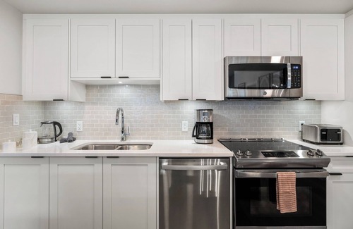 As you step inside, the open-concept living area captivates with its grand windows, which bathe the space in natural light and showcase breathtaking views. The living room is thoughtfully designed for both comfort and aesthetic appeal, making it an ideal space for relaxation or entertaining guests. Adjacent to this space is the sleek, modern kitchen, equipped with high-end stainless steel appliances, quartz countertops, and generous cabinet space—perfect for culinary adventures.