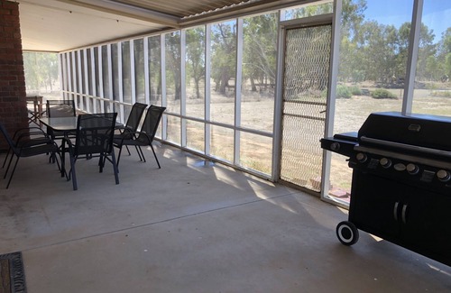 1950s 3 bedroom homestead set in a beautiful location overlooking a dam and magnificent river red gums. On a real working farm of 4200 acres with cattle, sheep and crops. There’s always lots to see and do on the farm and it’s a picturesque drive to various towns.