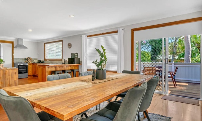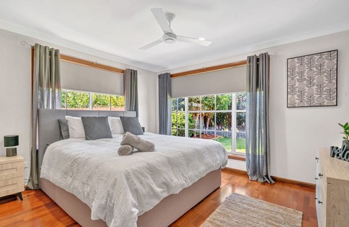 The home has three (3) bedrooms ready for any family or group, each has built-in robes and ceiling fans, providing an oasis of comfort and style that caters to all. The luxurious master bedroom has a comfortable king bed, access to the shared bathroom and a walk-in robe. Blockout blinds and a ceiling fan allow for privacy and comfort throughout your stay.