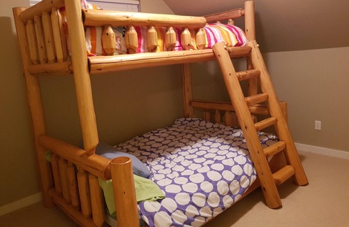 Upstairs has the second bedroom with a bunk bed (double bed on the bottom, single bed on the top). A great feature with this cottage is having the bedrooms separated on each floor. There is also a pull-out queen sofa bed in the loft area. A second TV is upstairs as well as a second full bathroom.