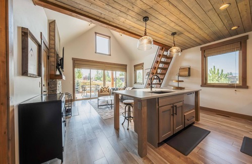 The home’s immaculate interior showcases soaring vaulted ceilings and plentiful natural light, creating an environment ripe for connectivity and relaxation. Sink into the plush sofa or armchair in the living room while you stream episodes of all your favorite shows on the mounted smart TV, the wood-burning fireplace keeping you toasty during the cooler months. Steps away, the stylish kitchen showcases stainless steel appliances, glossy stone countertops, and warm wood cabinetry stocked with cookware and dining ware for all your culinary endeavors. When you’re not dining outdoors in the fresh mountain air, grab a high-top stool at the island, suitable for enjoying meals both casual and formal.