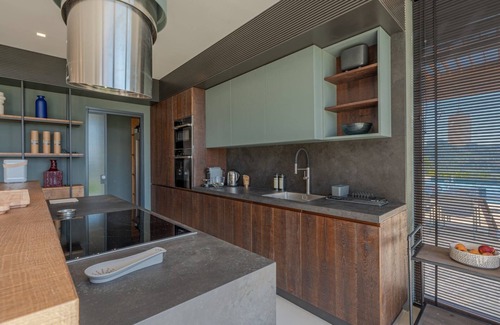 Inside, the open-plan living space is filled with natural light thanks to floor-to-ceiling glass doors that connect the house with the outdoors. A minimalist modern kitchen, distinctive lighting and carefully selected contemporary artworks complete the design-led interior. A wonderful place for those who appreciate wine, design and laid-back elegance.