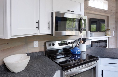 Experience a modern cabin with expansive river views, accommodating six guests with a queen-size bedroom, a lofted space with two twins, and a bunk bed with a nook, reading light and semi-private curtains. Amenities include a fully equipped kitchen, living room with sofa, 50" Smart TV, electric fireplace, and an additional Smart TV in the main bedroom. Outdoor amenities feature a private furnished patio, hot tub, charcoal grill (no charcoal included), and fire pit with Adirondack chairs. This cabin is dog-friendly.