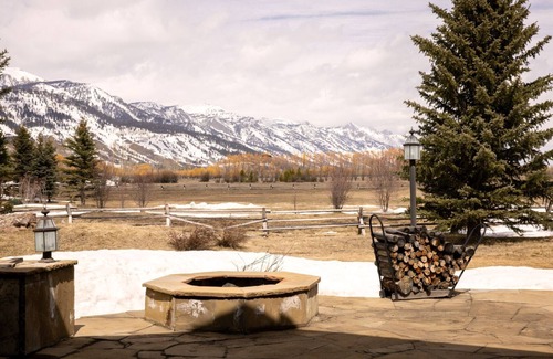 Outside, enjoy an oversized stone patio, complete with unobstructed views of the Teton Cathedral, an in-ground hot tub and a large fire pit to gather around-ideal for morning coffee, evening sunsets, or soaking in the surrounding natural beauty.