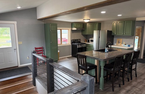 The heart of the home features a newly remodeled kitchen with brand new appliances and a matching kitchen island, perfect for preparing meals. Year-round comfort is ensured with our new AC and heating system controlled by an Ecobee smart thermostat. The beautiful four-season porch provides a relaxing space and houses commercial washer and dryer for guest convenience. The spacious living area invites you to unwind on our sectional sofa with chaise or settle into one of three comfortable lazy boy chairs, while the dining area offers the perfect spot to gather for meals with views of the expansive countryside.