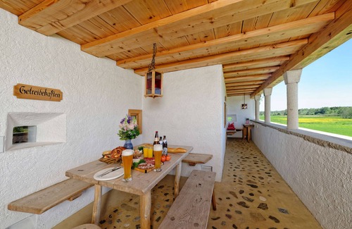 'The adventurous'. Exclusive apartment of a very special kind with flair and aesthetics. Maisonette with three separate bedrooms. Very cozy as before: the open form of living. Original Chiemgau farmhouse parlor with historic tiled stove and children's hatch; handmade solid wood furniture with natural surfaces; stylish wooden and vaulted ceilings based on the old model; biological lime-sand plaster; romantic lighting; fantastic patio with the best view of meadows and forests; Entrance via arbor, second entrance via oak bridge. Calm force and fine sound.