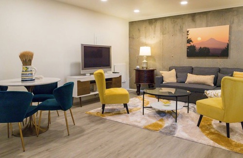 The swanky décor, well-stocked kitchenette, and spacious living room and dining area highlight this space. A large covered deck perfect for sipping a glass of wine overlooks the yard and the Willamette Valley. This flat will accommodate 3. Independent keyless entry and convenient parking.