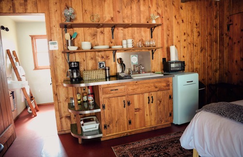 Step back in time at our 1950s Old West-style motel! It’s just minutes from the National Park and a short walk to downtown restaurants, bars, the Farmers’ Market, and local shops. Each cozy room features a kitchenette, bathroom/shower, and warm desert decor. Tucked away from the highway, enjoy a peaceful, private escape with HVAC and complimentary coffee & tea. Stay where charm meets comfort in the heart of Joshua Tree! **Room 1 and 2 have a shared door in the room.