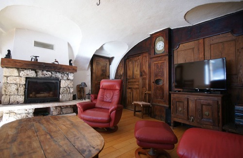 -A vaulted living room of 26 m² with a large south facing bay window, 1 tufa stone fireplace (wood is provided), 2 sofa + 2 armchairs, 1 coffee table, 1 40 "HD TV with USB and HDMI connection, Home Cinema.