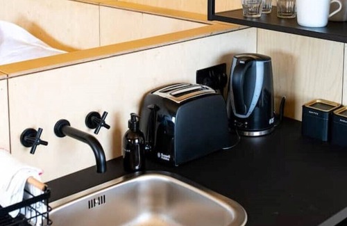 The cabins are next to a rustic old barn weddings and events venue with fantastic sea views across St Andrews Bay up the North East coast of Scotland. They sleep 1 or 2 people in double or twin beds with room for a travel cot. Linen and towels provided. Each cabin has an en suite bathroom with toilet, basin, shower and shaver socket. The kitchens include a microwave, kettle, toaster, sink, tea, coffee, sugar, milk, salt, pepper, chopping boards, cutlery, crockery, knives, glassware and fridge with freezer. There is a table and two chairs for eating. The cabins are heated with electric underfloor heating and have hot water. Pets are welcome in cabins 1, 4, 6, 7, 9, 10 while the pet free cabins are 2, 3, 5, 8.