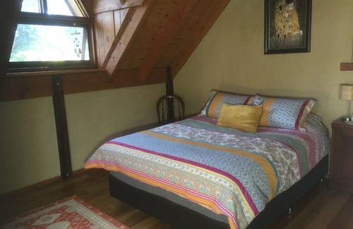 Enjoy the rustic ambiance and romance of a hand crafted mud brick and reclaimed timber-dwelling . Located in a quiet court with secluded private gardens. Only a stones throw from local cafes, pub and shops. Be stunned by the architectural detail as you enter the front door. Huddle by a wood fire in a cosy lounge when mountain mists surround , relax in the sun lounge watching birds in towering gums through full height windows, enjoy a moon rise through French doors of the mezzanine lounge. A fully equipped cottage style kitchen may tempt you to relax in for your short stay. Wineries cafes and attractions of Healesville and the Yarra Valley a short drive through countryside and mountain forests. Surrounded by National Parks with long bush walks or a short stroll to a waterfall. A true getaway experience.