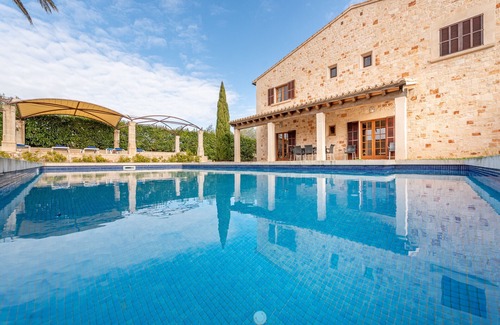 Spectacular recently-built stone house in the traditional Mallorcan style for 8 people.The beautiful entrance, with an iron fence, leads us inside the house, where we find a small hall with a staircase leading us to the second floor. Through the entrance hall we enter into a spacious living room with a sofa area next to the TV and a nice designer fireplace. On the other side is a large dining table, next to this is the access to the fully-equipped kitchen with oak furniture. On the ground floor is a bedroom with a large double bed and a complete bathroom with a bathtub.On the second floor, there are three double bedrooms, all with en suite bathroom and bathtub, two of them have two single beds, and the other room, a large double bed.From the dining room, you access the covered terrace with a large dining table. The garden with lawn and palm trees is very spacious and is surrounded by walls that offer a lot of privacy. The 10-metre pool is surrounded by lawns and several terraces with sun loungers, one of the terraces is covered.The house has air conditioning throughout the house, satellite TV and wifi.