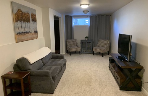 Cozy, clean, mother-in-law suite with a full kitchen and washer/dryer located in a quiet neighborhood just 5 minutes from the airport. We offer a comfortable king size bed and a full-size fold out sofa bed. We also offer great Wi-Fi and privacy for those who work remotely. The entrance has 26 steps with a handrail, so this place may not be the best for those with mobility concerns.