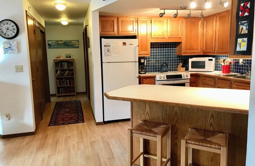 An ideal setting for a family getaway, this first level, end unit provides easy in-and-out access of the complex. The hardwood floors, nautical decor, and gas fireplace create a warm, beach-y atmosphere, while the open living and dining areas provide easy, outdoor access to a private and enclosed deck area from two sliding doors. The well-stocked kitchen has all that's needed to whip up those fun, family meals.