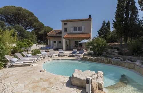 Sea views, heated pool, 300m from beach in Sainte Maxime, near St Tropez is located in Plage de la Garonnette. Sea views, heated pool, 300m from beach in Sainte Maxime, near St Tropez provides accommodation, featuring Parking, Private Pool, Balcony/Terrace, among other amenities. This Villa features Parking, Private Pool, Balcony/Terrace, to make your stay a comfortable one.