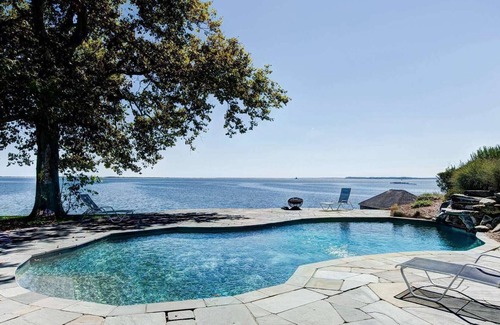 Coveted and rare rental located on the bay in private setting overlooking Bug Light and Shelter Island. Heated, waterside pool. One floor living. Incredible sunrises. Living room with fireplace, sunroom. Open kitchen/ DR w/sliders to deck. Waterside master suite w/full bath, 3 additional bedrooms w/guest bath. Large 3+ car garage. Private yard space. The ultimate North Fork beach house rental for you and your guests. Home sleeps up to 12 people comfortably. Tara-by-the-Bay. Close proximity to area farm stands, lavender fields, wineries and destination restaurants in Greenport.