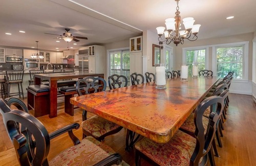 ✔ Custom-built family gathering table with seating for 18 overlooking the lake