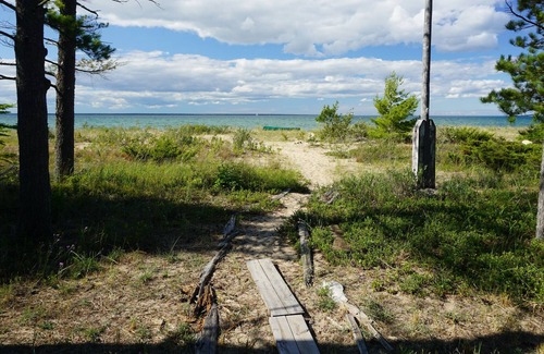 One of a kind. This is a log cabin originally built with logs harvested from the property in the 40s as a hunting lodge. It is on Lake Huron with gorgeous views of the straits of Mackinaw, Bois Blanc Island and on a clear day the Mackinaw Bridge. The sunsets are out of this world. We are surrounded on all sides by Nature Conservancy forest, and it is not unusual to walk the beach for a couple of miles without encountering a soul. The beach is largely sandy and the drop off is shallow with several sand bars. The swimming is excellent. We have a canoe and kayaks for exploring the area or even going out to Poe Reef lighthouse if you are adventurous.