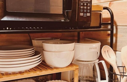 The Finn Cabin hosts two queen beds, a full shower, a microwave, a coffee maker, and a television. Seeking rest + relaxation will be a joy at the Finn Cabin. There is a shared fire pit located behind the cabins. Fire materials can be purchased at Thriftway.