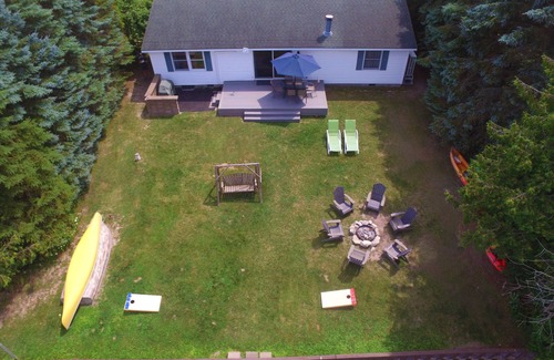 Enjoy beautiful sunsets from your lawn and dock on 80' of private frontage surrounded by majestic northern pine trees. Private lakeside yard also has a fire pit, deck with deck table, various chairs and seating options, a propane grill, and a dock. The dock area is shallow and about three feet deep at the end of the dock. Also included are a canoe, kayak, and two stand up paddleboards to explore the lake. If you have a boat you are welcome to anchor your boat off shore from the house or tie up to the dock. The public boat access is a 2 min drive away.