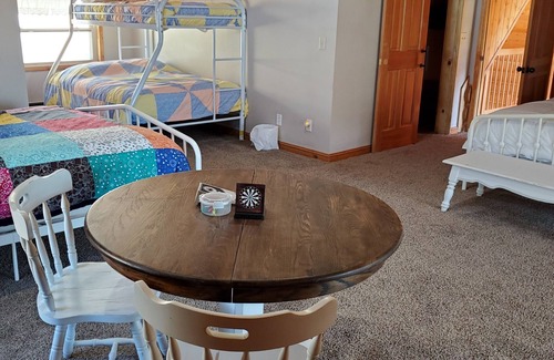 A unique 3 story cabin with private bedrooms and large gathering areas. Large spacious kitchen with industrial oven, refrigerator and freezer. Outdoor hot tub, billiards table, foosball and many more large group activities.