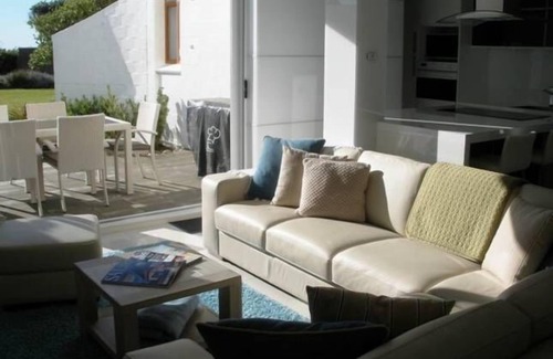 This two bedroom ground floor apartment, with the beach on your doorstep, can accommodate a maximum of 5 people. There is no road in front, just lawn, sand dunes and the beautiful beach, ensuring unrestricted, spectacular ocean vistas, stunning evening sunsets, and that much desired peace and serenity.