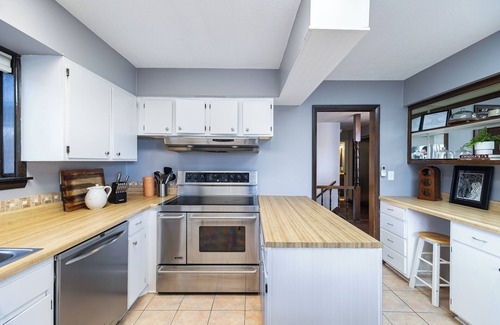 Inside you'll find the open layout of the house provides plenty of space indoors to relax and enjoy each other's company. The walk way comes in level from the driveway into the house and the open first floor plan make it perfect for navigating if you are an elderly guest. The kitchen is off to your right when you walk in with stainless steel appliances and a large stove/oven. Going through the kitchen, you'll enter the dining area which is open to the living room with large windows overlooking the lake and patio doors to the deck. The living room has two separate seating areas with several couches and multiple patio doors onto the deck overlooking the lake, along with a cozy sitting area in front of the wood burning fireplace.