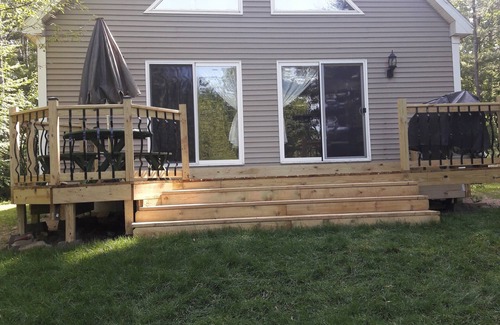 Spacious four bedroom/three full bath home sits nestled in the woods on the Platte River in the Sleeping Bear Dunes Region of Michigan. The property features two master suites, one up and one down. The house is furnished and includes a fully stocked kitchen and linens and bedding are provided for your convenience. There is a large loft for families to gather and watch movies or play games while enjoying the view of the scenic Platte River. Enjoy the outdoors on the large deck equipped with grill and an outdoor dining table. Sit and relax on one of the two docks or drop a line and fish for a bit. A fire pit is available for an evening fire.