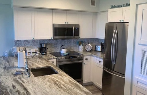 The condo boasts 2 bedrooms and 2 baths. Completely remodeled with all upgraded finishes throughout. Features include beautiful cottage style wood like flooring throughout, new cottage style kitchen with counter and 4 counter height stools, living room seating for 5. Watch the sunrise in the morning with ocean views from the living room and/or master bedroom.