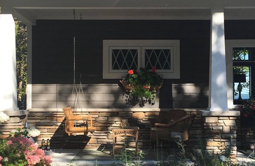 "SUNRISE ON SUTTONS BAY" was designed by a local Architect to frame views of the Bay from every room. Pulling Into the Driveway You will see the magnificent blue waters of Sutton's Bay. The Foyer Gives Way to a Two-story Living-room, Vaulted Ceilings, a Gas Fireplace With Gorgeous Two-story Stone Chimney and a Glass Wall of windows With Views from Water to Sky. There Are Several Inviting Seating Areas Including the Living-room With Two Full-sized Sofas, the Loft Library Perfect for Cards and Games With Large Sectional Sofa, and the Screened Porch With Sectional Sofa and Lots of Cushions. Downstairs, there is a large leather sectional sofa and a 70" screen smart tv for a fun family movie night or a rainy afternoon snooze! There Are Additional Areas to Gather Out On the Back Deck and a Charming Swing On the Front Porch.