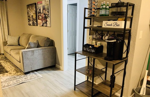 Completely remodeled 2 bedroom, 1 bathroom townhome with covered parking and street parking. Large backyard comes with patio furniture and BBQ grill. Firepit is included in the front courtyard area. This contemporary interior is divine and has Las Vegas written all over it. Complete with a full size washer and dryer as well. TV's are in each bedroom and the living room. All the necessity to bring your alcohol and set up a full bar just for you. Snacks, coffee, and tea are provided! Full kitchen should you decide to cook a gourmet meal. Each bedroom comes with a Queen size bed, the Owner Suite mattress is VERY PLUSH while the Guest room is medium plush. We know one bathroom can sometimes be a challenge so we have included a vanity in the Owner Suite. Plenty of closet space in both bedrooms so don't worry about where to put your clothes.