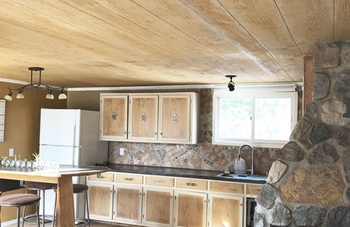 Beautiful hand crafted rock fire place, large yard and all the comforts of your own home. Brand new king and queen beds and conventielly close to all northern michigan has to offer.