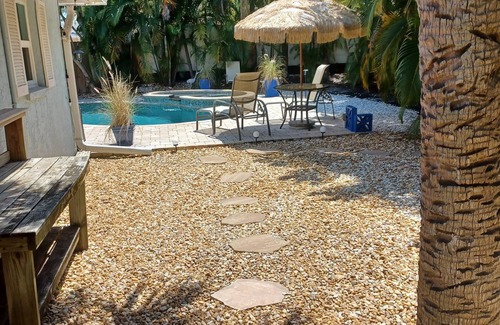 Tropical oasis w/ hot tub & oversized heated pool. Beach cottage w/ No stairs to climb, 3 blocks from beach, bike to Siesta Village shops/ restaurants/ entertainment, bars, live music & shopping! Convenient to everything on our Suncoast. Very private spot, easy on/off island to airport, UTC, Ringling Museum, St. Armand's Circle & Longboat Key. Palm trees, Tiki umbrellas & party space galore. Hawaiian dining / seating decks throughout this sprawling Florida native landscaped gem. Eat-in kitchen. Huge yard surrounded by palm trees. Quiet, safe neighborhood. 3 Wide-screen TVs, Comfy beds, Hurricane-safe, Sea Birds & local parrot landing spot. Weber gas grill gets the party cooking. Lots of parking space. Lic. #VR22-00123