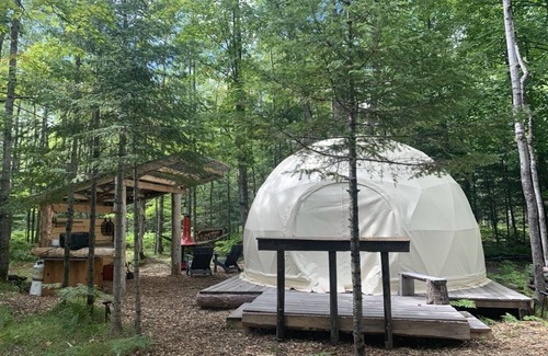 The Dome includes: All dishes, utensils, towels, 5 gallons of water, cast iron skillet, water kettle, French press, gas grill, wood fired grill, flashlights, lanterns, fire wood & kindling are all included and are at the Dome site. The saunas, lake and boathouse are a 5 minute walk with access to all paddle boards, kayaks and the boathouse. The boathouse has a full kitchen, gas grill, flat top grill, dishes and all utensils needed.