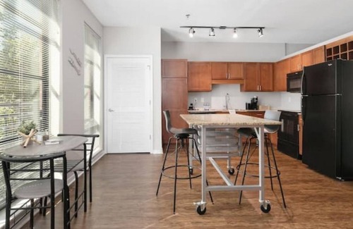 The kitchen is equipped with two bar seats. You’ll love the clean lines, high ceilings, and new furniture to elevate your dining experience.