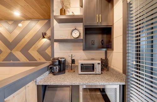 Alpine Splash features 5 private bedrooms, 4 with King size beds and every bedroom has en-suite bathroom access. Groups of up to 20 guests can spread out in this luxurious brand new cabin. The cabin features a private indoor pool, game room with arcades and board games, private indoor theater with 85" TV and Sonos surround system, a fully appointed kitchen for all of your cooking needs, a private hot tub with mountain views and a private fire table with rocking chair seating near the hot tub.