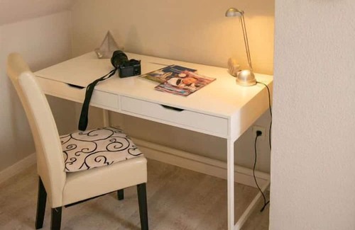 Top apartment between Husum and Sylt, sauna and pond in the garden, large roof terrace with furniture, table tennis plate, grill, WiFi, a price-allches included! The apartment on the attic is wonderfully cozy and bright. In 2019, the new Loft roof terrace with lighting was completed. In 2022 we laid a high -quality design plank in the apartment and equipped the living room with new furniture. The apartment has its own parking space directly at the apartment and its own entrance. The garden with sun terrace is available to both apartments. The sauna with a relaxation area is exclusively available 3 times a week. Living room Gray leather couch, new furniture (2022), 32 "LCD TV, DVD player, literature and travel guide about the region with tips for eventful days in the North Sea. bathroom Subdoors with shower, washing machine, towels included. Wall hanging toilet (new in 2022) Bedroom 1 Double bed 180x200, good mattresses, bed linen
