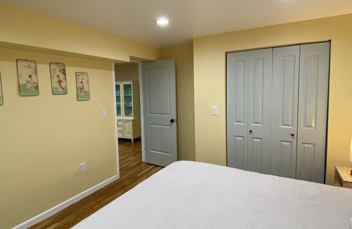 Well, this mother in law suite is located in the south end of town, in a quiet neighborhood. It’s newly renovated and has original 1966 hardwood floors, a brand new kitchen and a pretty fabulous bathroom. The oil paintings make it feel warm and inviting.