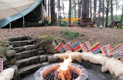 Our guests have access to three peaceful acres of communal gardens and woodlands. There is a stone fire pit in the woods and for the kids a forest zip line, kids den, hammocks and a swing.
