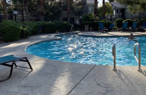 Luxury apart 2min from freeway. With 2 pools on property including a gym, with lots of free parking and a dog park. Inside the apartment are all the amenities that make traveling easier. Washer dryer, full kitchen, Wi-Fi, and clean refrigerator. Almost makes you okay with just a staycation as well.