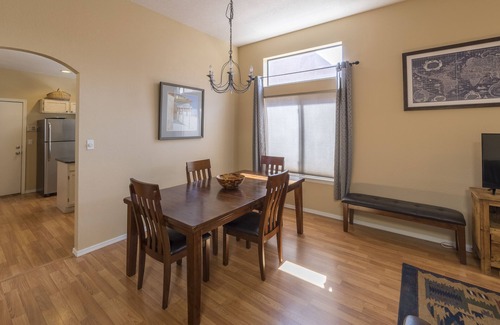 Our home is located in a quiet, residential neighborhood at the base of the Sandia Mountains. Our comfortable living room features a Roku-equipped TV to access all of your favorite streaming services. The dining room easily seats six with our extendable table featuring a hidden leaf and an additional two-seat bench. The fully-stocked and recently renovated kitchen includes a breakfast nook with mountain views. Just off the living room is a quiet study, perfect for reading and catching up on email via the high-speed wireless internet.