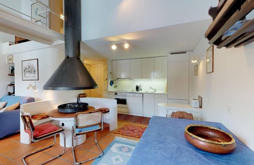 Spacious and quiet 2-room apartment on two floors, 45m2, facing north. Ground floor: living/dining room with a fire place (just for show, not to be used). Phone, radio and TV. Open kitchen with oven and dishwasher. Raclette set. Coffee machine CHICCO D'ORO. Shower/toilet/sink. Gallery, half open to the living room: 2 single beds (2x80x190) low to the floor, bath/toilet/sink. Garage. Shared washroom and ski/bike room. This apartment is suitable for young guests without children. Animals are not allowed. Non-smoking.