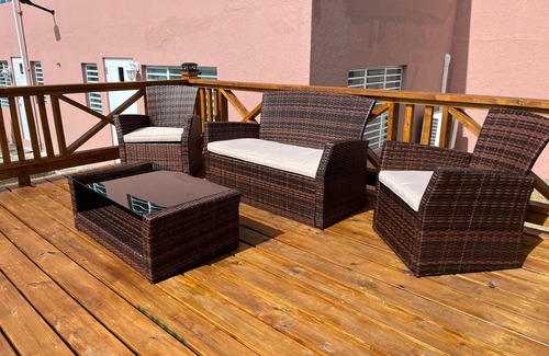 The apartment is large and spacious with generous spaces allocated for the bedroom, living room and kitchen. Its on the first floor of a two floor house and the owners lives upstairs. The living room has a full sized Futon/Chair bed in the event that an additional adult wishes to stay or 2 small children.