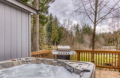 Step outside to the peaceful back deck area to find the outdoor table and chair set, a barbecue grill station, a large lawn, and a luxurious hot tub, making it the perfect setting for hosting a fun-filled cookout while listening to the calm waters of the nearby stream, playing yard games with the young ones amidst the forest scenery, or taking a well-deserved soak in the tub after a long day of adventuring under the starlit Oregon night sky. For extra fun, stroll behind the cabin to the secluded firepit and outdoor area for those special nights filled with campfires and smores.