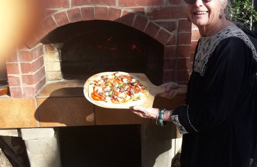 This apartment is 1000 square feet, has AC, a washer & dryer, lots of kitchen supplies full bathroom, living & dining room & bedroom. Deck leads to large fenced yard with grill & pizza oven & gardens.